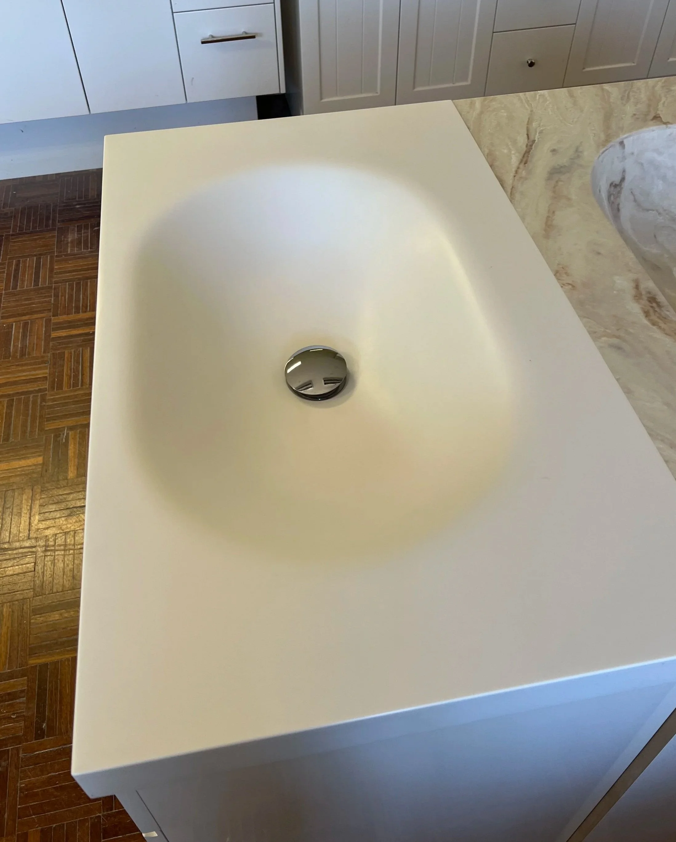 A solid surface sheet is thermoformed in engineered moulds to create this “pill” shaped basin.